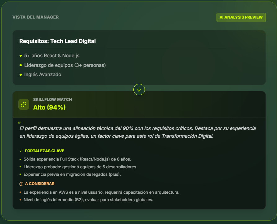 SkillFlow no solo busca palabras clave. Nuestro motor de IA analiza el contexto, la experiencia y las habilidades blandas para sugerir los mejores matches internos, eliminando el sesgo y ahorrando horas de revisión manual..