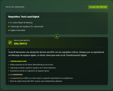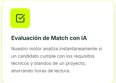 Evaluación Asistida por IA: Compara perfiles contra requisitos técnicos en segundos, no horas.